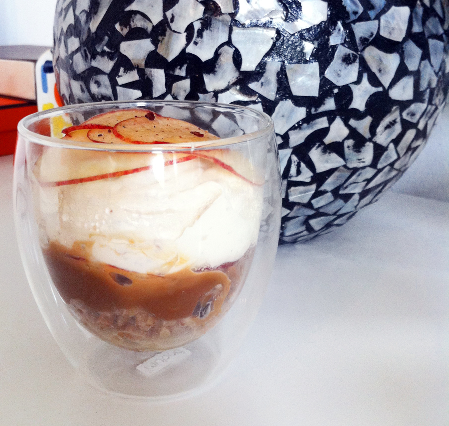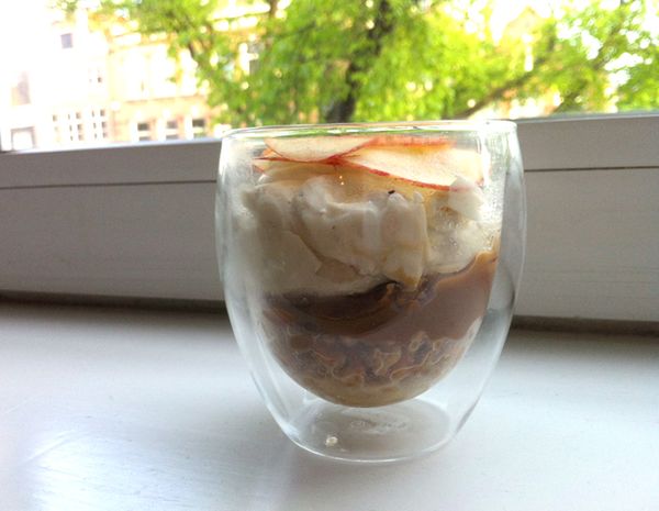 Klop de mascarpone met de melk samen tot een zachter en smeuig geheel. Neem de vanille essence of snijd een verse vanilleboon open en gebruik dit. Voeg de vanille toe aan de mascarpone en klop goed door. Niet zoet genoeg? Je kunt altijd wat (poeder)suiker toevoegen. Haal de glazen uit de koelkast en schep een lepel van de caramel fudge saus bovenop de crueslibodem. Leg daar een paar schijfjes appel op, en daarop een grote lepel van het mascarponemengsel. Maak af met nog een paar schijfjes appel en wat kaneel.