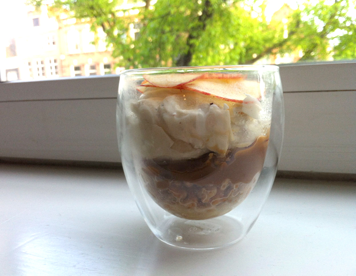 Neem mooie glaasjes (wij gebruikten dubbelwandige glazen van Bodum). Laat in een pannetje de boter smelten en een beetje bruinen (niet aanbakken!), draai het vuur uit en doe er vervolgens de cruesli bij. Snel omscheppen zodat de cruesli een boterlaagje krijgt en dan over de glazen verdelen. Even in de koelkast wegzetten.