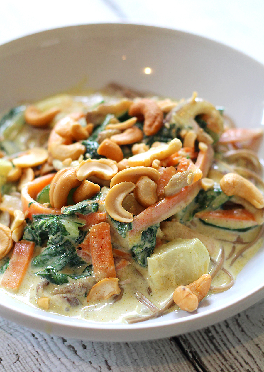 Serveer de curry met de soba noodles en bestrooi met de geroosterde cashewnoten.