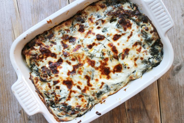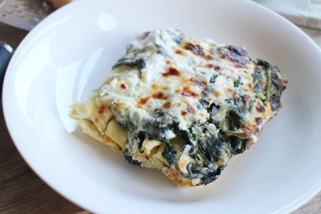 Vet een middelgrote ovenschaal in met boter of olijfolie en beleg de lasagnevellen voor eenderde (gezien vanaf de korte kant) met een flinke lepel van het pompoenmengsel. Leg hierop een paar stukjes hazelnoot en een lepel spinazie. Rol de vellen strak op en leg in de ovenschaal. Ga zo door totdat alle lasagne op is.