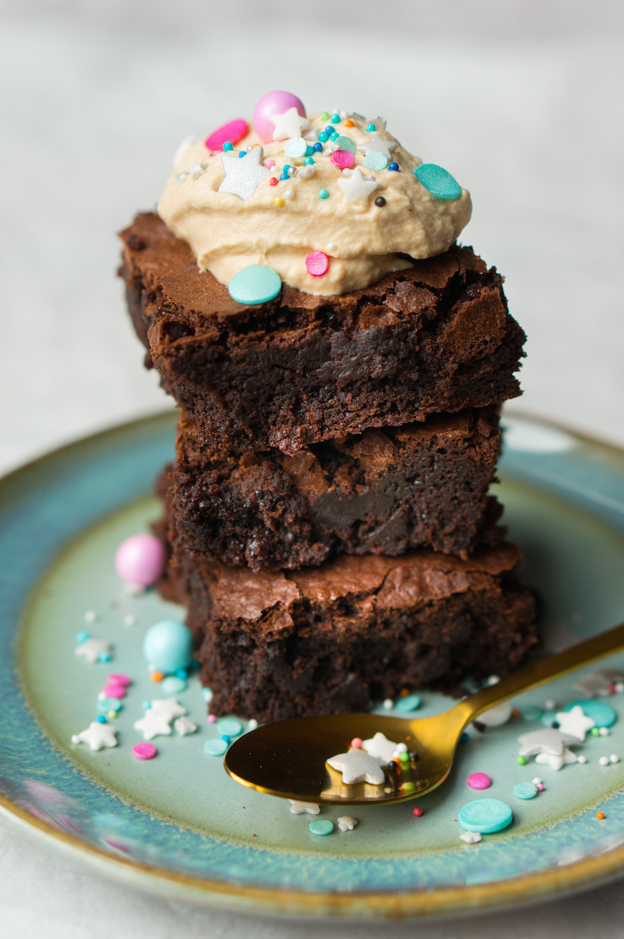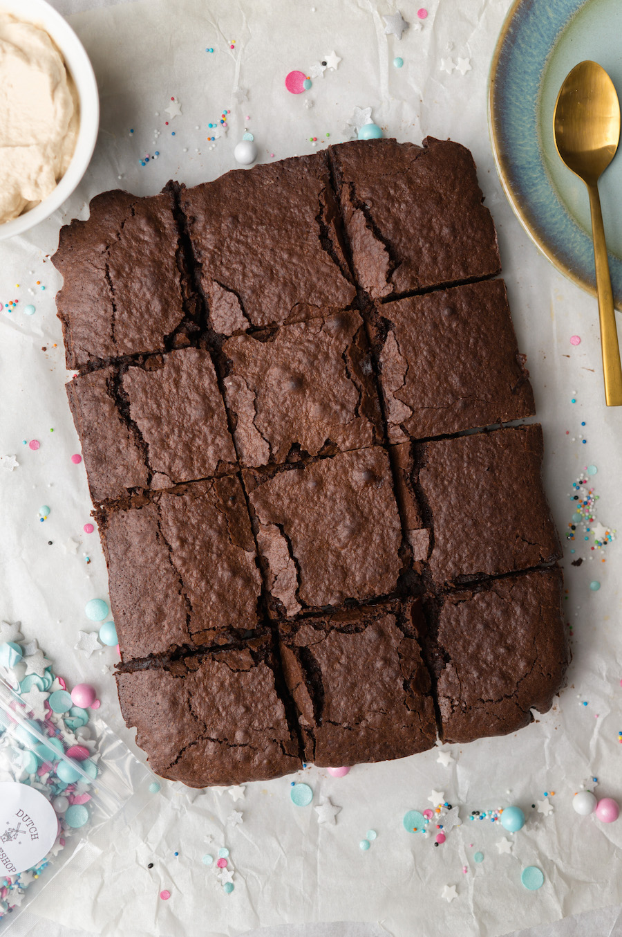 Deze verjaardags brownies zijn super als er iemand jarig is, maar ook een feestje op zich. Stel je dit voor: chocoladeachtige, sticky brownies. Met daarbovenop een flinke toef koffieroom en de tofste sprinkles ever. Op en top feestelijk!