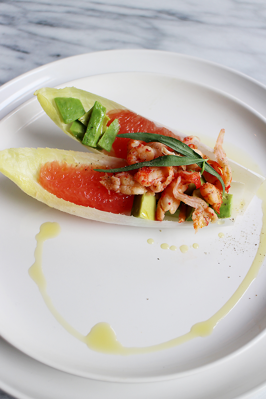 Witlofschuitjes met rivierkreeftjes, grapefruit en avocado