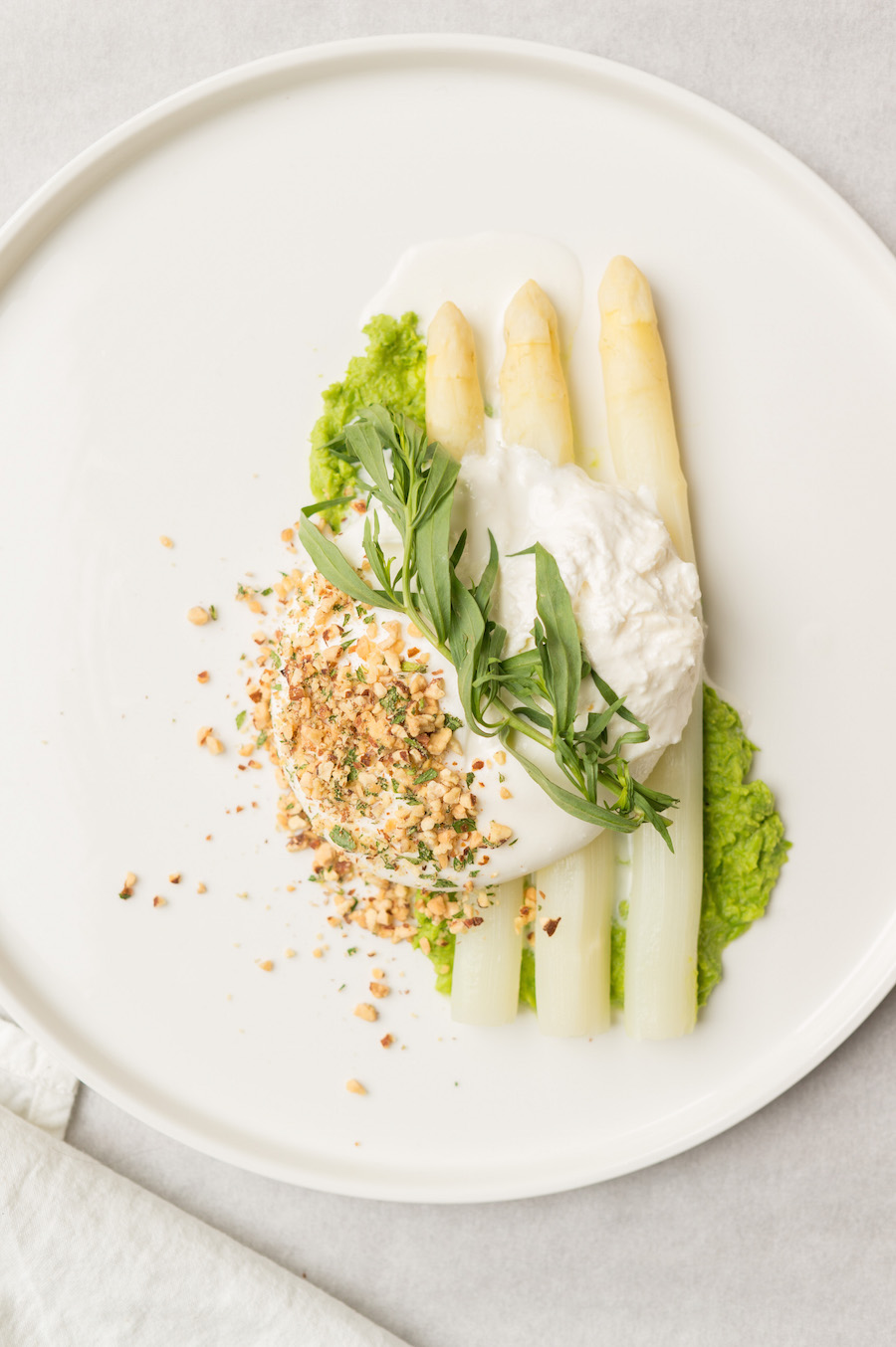 Nu ga je het bordje opmaken. Trek met de achterkant van een lepel een schuine baan van de doperwtenpuree over het bordje. Leg daar drie witte asperges (of meer…) op. Daarop gaat de burrata, waarvan je de zijkant bestrooit met de dukkah. Maak eventueel af met nog wat extra dragon.