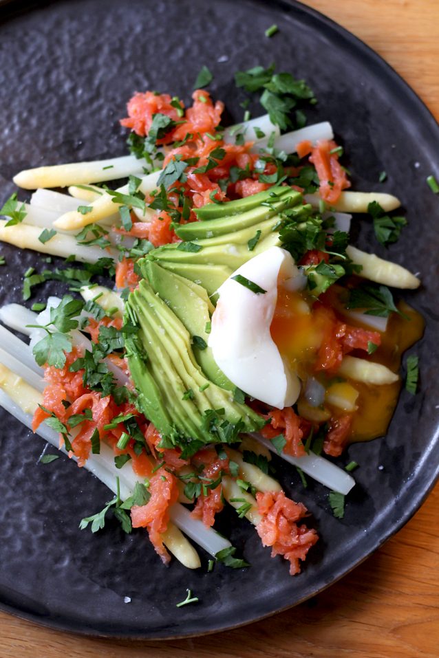 Lekker snel op tafel en perfect voor dit seizoen: witte aspergetips (eigenlijk gewoon mini witte asperges) met wilde zalm, avocado en een zachtgekookt eitje.