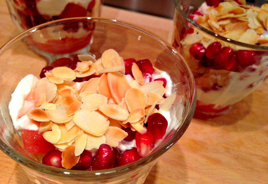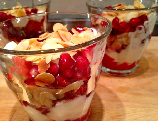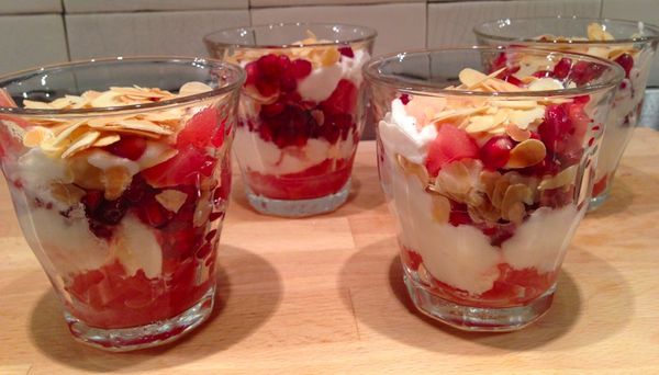 Neem de glaasjes en maak laagjes met de peertjes, yoghurt, granaatappelpitjes en amandelschaafsel. Eindig met het schaafsel.
