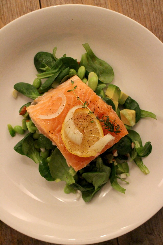 Een heerlijk fris lentemaaltje dat ook prima als lunch (eventueel de volgende dag) kan. De zalm uit de oven mag nog best een beetje rauw blijven en de salade breng je op smaak met een Japanse dressing. Yum!