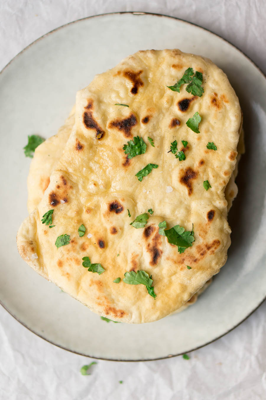 - Bestrijk het naanbrood voor het serveren met wat gesmolten knoflookboter en bestrooi met fijngehakte koriander of peterselie.