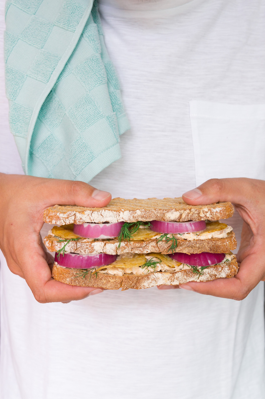- Beleg de toast met de kipsalade. Leg er wat chips op en de rode uiringen. Leg er nog een stuk toast bovenop en druk goed aan, zodat je de chips hoort kraken.
