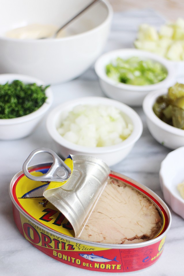 Wij gebruikten voor deze salade de prachtige blikjes van Ortiz, een familiebedrijf uit het Noordwesten van Spanje. Zij gebruiken voor de conserven albacore (witte) tonijn, een soort die (afhankelijk van het viswater) niet overbevist is. Kijk op de viswijzer voor meer informatie over duurzaam gevangen tonijn.