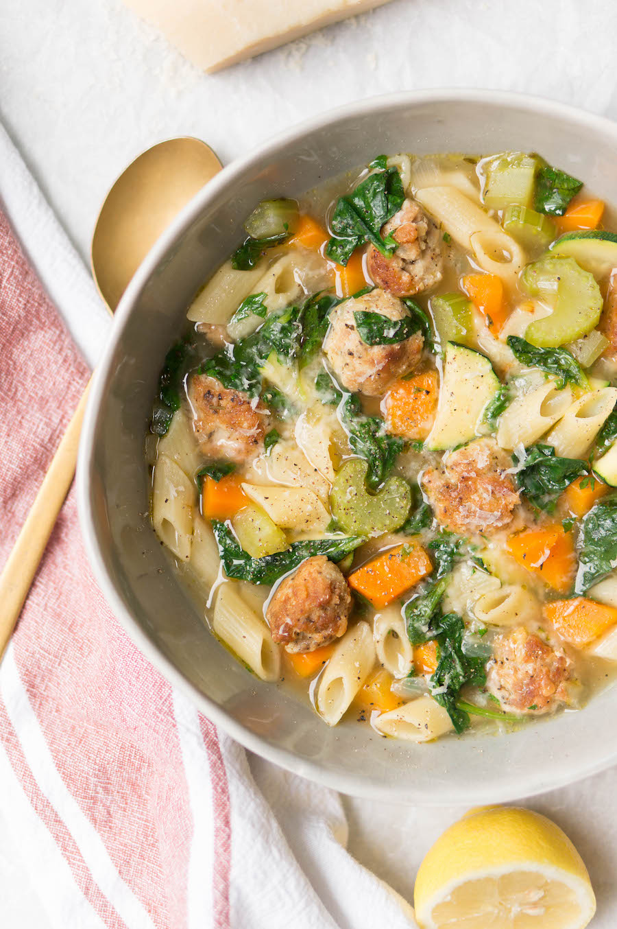 Bij recepten voor warme dagen denk je misschien niet direct aan soep. En toch is deze zomerse minestronesoep een dikke vette aanrader. In tegenstelling tot koude maaltijden, helpt het je lichaam af te koelen. Deze soep is bovendien licht en fris en toch ook lekker hartig, dankzij de kipgehaktballetjes en de Parmezaanse kaas.