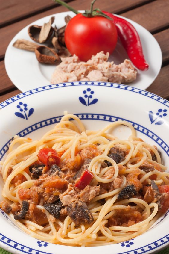 (Kijk voor de ingrediënten bovenaan.) Laat de funghi porcini wellen in warm water. Verhit de olijfolie in een koekenpan en bak de teentjes knoflook goudbruin. Haal de teentjes na een paar minuten uit de pan. Voeg de in ringetjes gesneden rode peper en de uitgelekte funghi porcini toe, bak even mee en voeg dan ook de verbrokkelde tonijn en de fijngeprakte tomaten toe. Laat de saus vijftien minuten op laag vuur pruttelen.