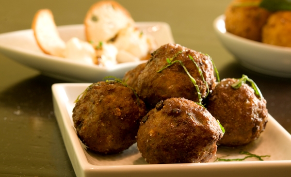 Bak ze, zonder ze te bewegen, tot de onderkant mooi goudbruin is en draai ze dan voorzichtig om met een houten lepel. Bak de balletjes tot ze helemaal rondom krokant en goudbruin zijn. Laat ze uitlekken op keukenpapier. Bestrooi ze met een beetje zout en dien ze op als ze een beetje zijn afgekoeld. Ze zijn ook lekker op kamertemperatuur.