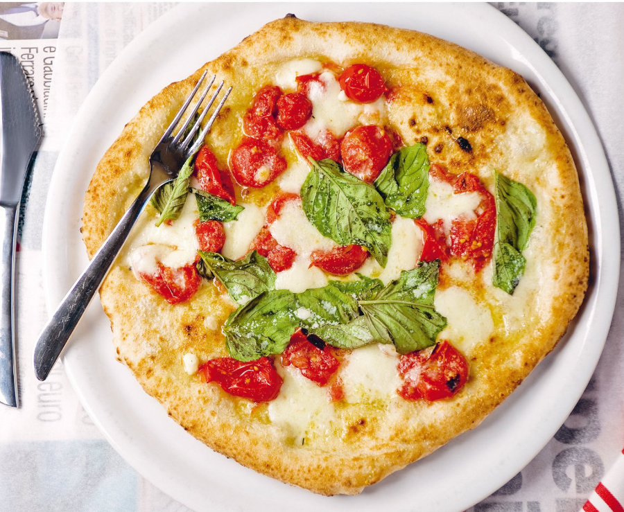 pizza margherita al piennolo, met kerstomaatjes, buffelmozzarella, pecorino en basilicum