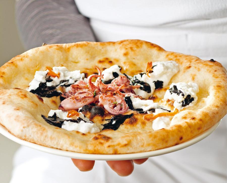 pizza in bianca e nero, met inktvisinkt, mozzarela, ricotta en inktvis