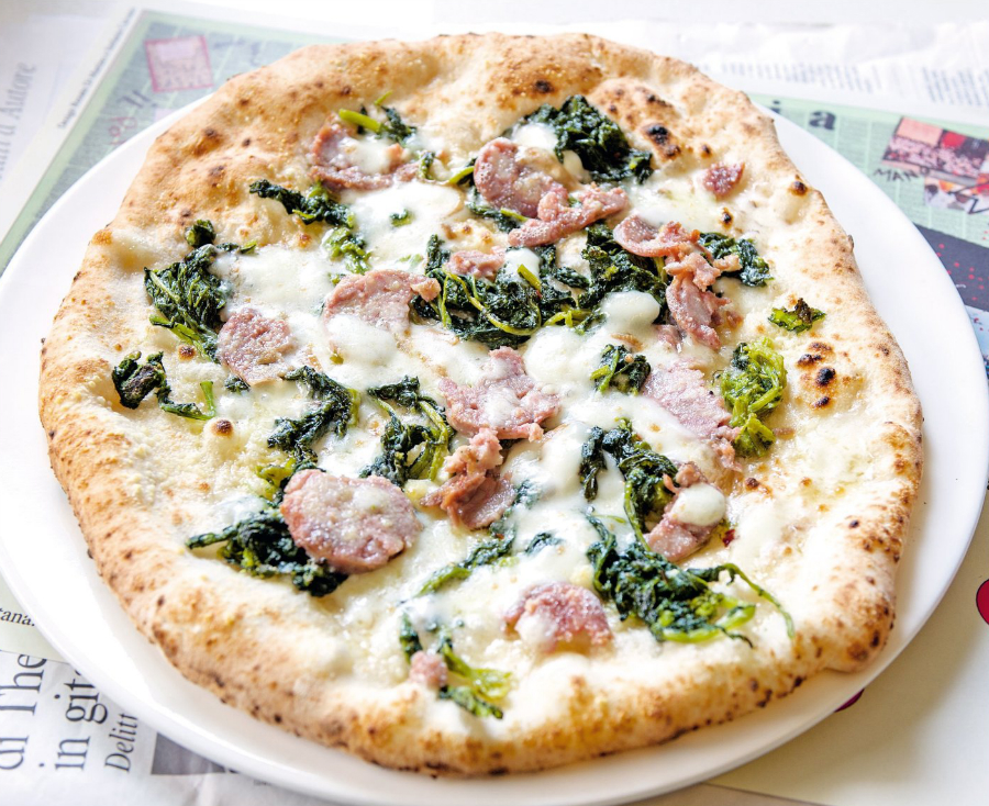 pizza salsiccia e friarelli, met buffelworst, provola, friarelli en pecorino