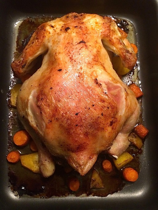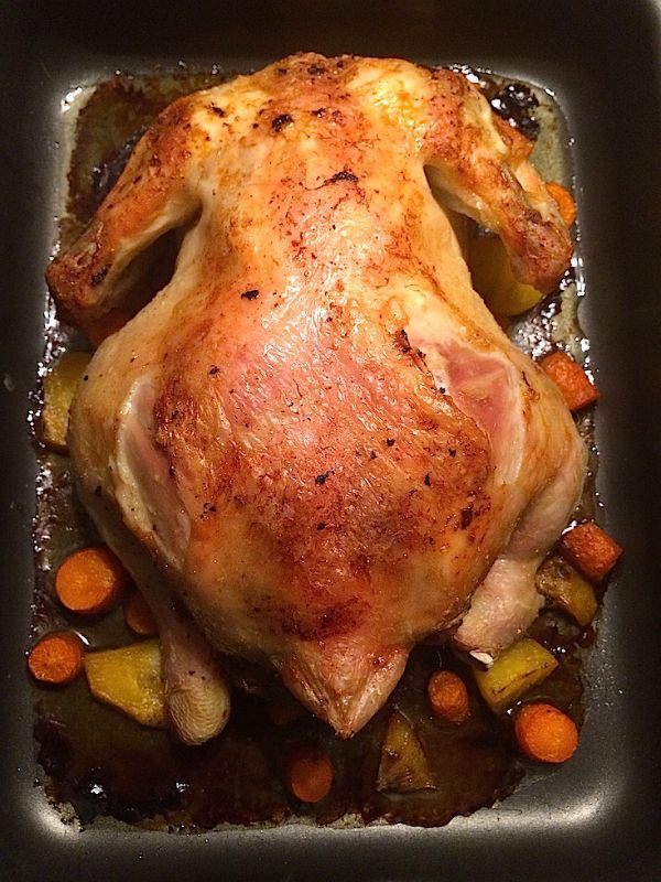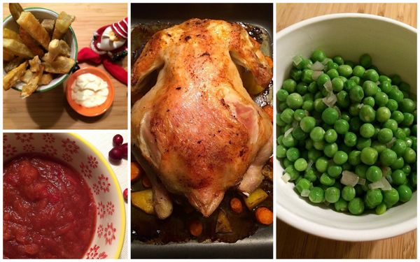 Serveer de geroosterde kip op een grote schaal en zet daar bakjes met appel-cranberry compote, zoete aardappel patat, mayonaise en doperwten naast. Succes verzekerd!