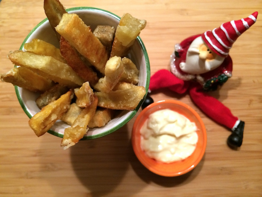 Ongeveer 2,5 uur voordat je het kerstdiner gaat serveren, schil je de zoete aardappels. Snijd ze in de vorm van frietjes en zet apart in een bak met koud water.