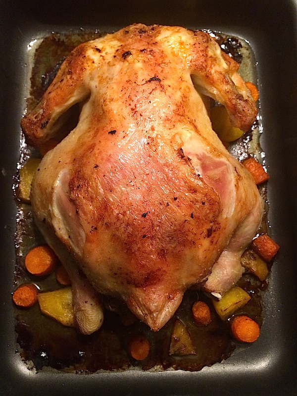 Hak wat wortelen, bleekselderij of andere groenten grof en leg deze onderin een bakblik. Leg hierop de gevulde kip en schuif het bakblik in de oven. Bak de kip 60-75 minuten in de oven totdat deze gaar is.