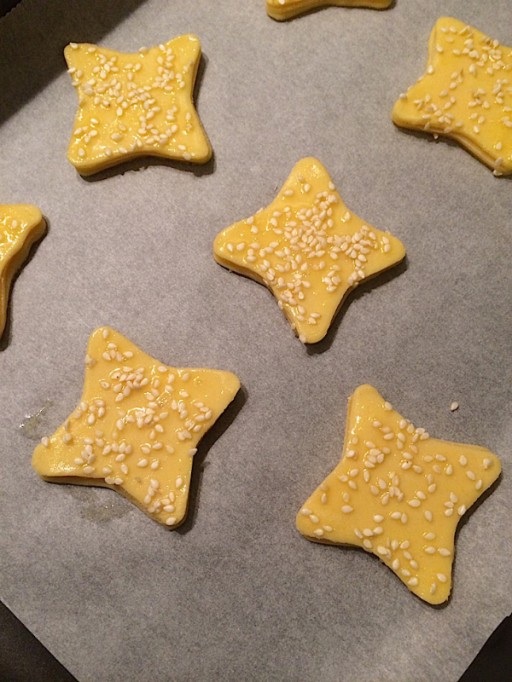 Leg alle sterren naast elkaar, bestrijk met een los geklutst ei en strooi er wat sesamzaadjes over. Zet de sterretjes 15-20 minuten in de oven totdat ze goed zijn ‘opgeblazen’ en een mooi goudbruin korstje hebben.