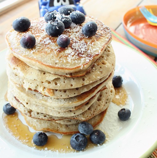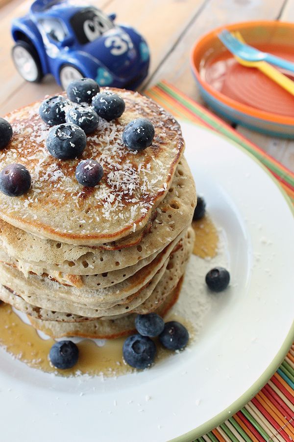 Serveer de pancakes met geraspte kokos, ahornsiroop en blauwe bessen. Het perfecte begin van je zondagochtend en je kids zullen je dankbaar zijn.