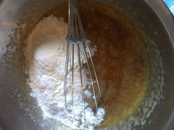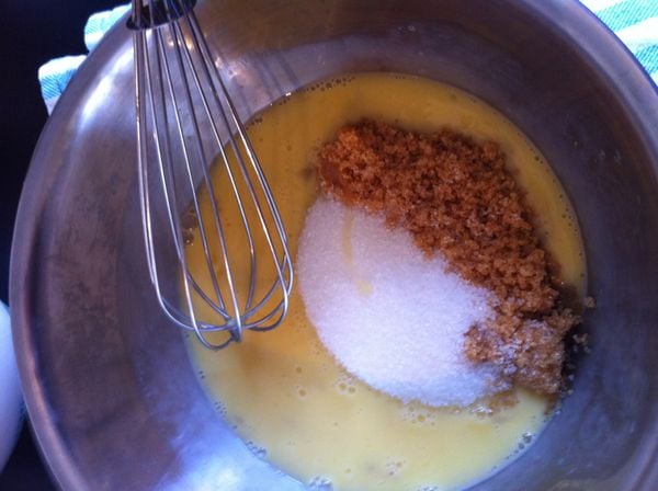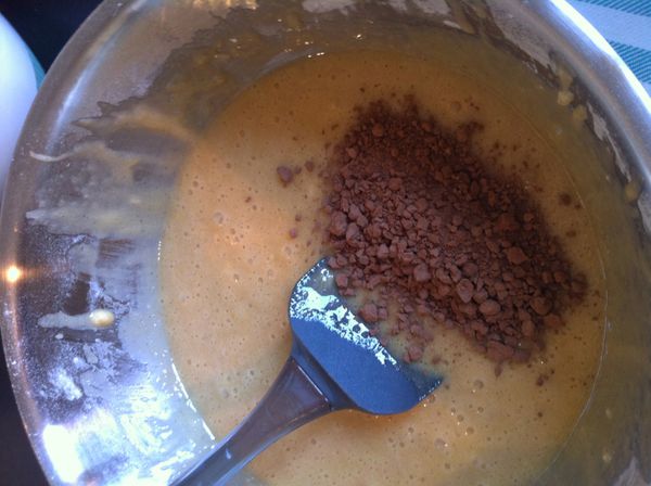 Maak in een kom een mengsel van de suikers. Roer de eieren los en voeg ze toe aan de suiker. Voeg dan het zelfrijzend bakmeel toe, het cacaopoeder en de vanillesuiker of extract. Roer goed door en voeg dan de gesmolten chocolade en boter toe. Op het laatst meng je de handvol chocolate chips er doorheen. Je beslag is klaar!