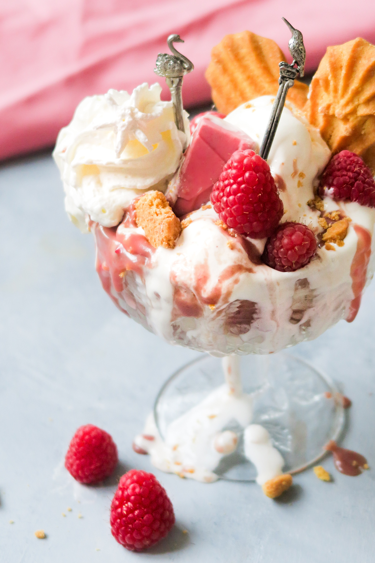 Werk af met frambozen, de stukjes koek en een toef slagroom.