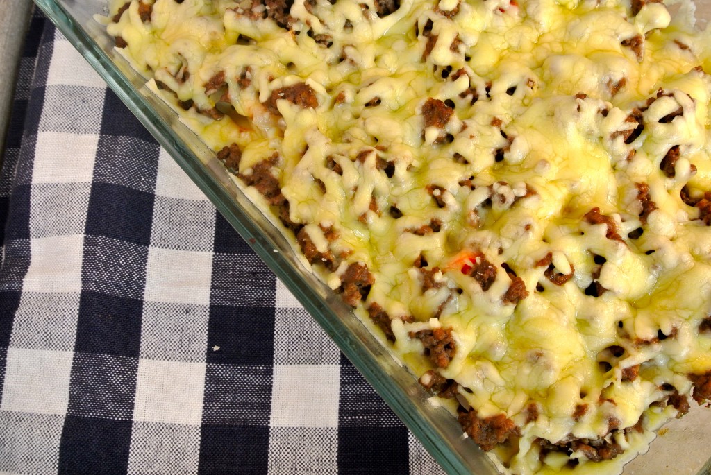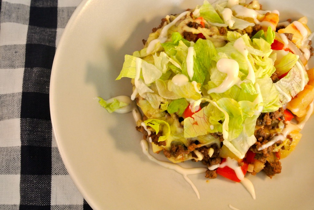 Als de aardappels klaar zijn schep je deze in een ovenschaal. Top met de groenten, dan het gebakken gehakt en daar overheen strooi je wat geraspte kaas. De ovenschotel kan nu voor tien minuten de oven in totdat de kaas gesmolten is. Als het klaar is serveer je het met wat gesneden ijsbergsla en knoflooksaus.