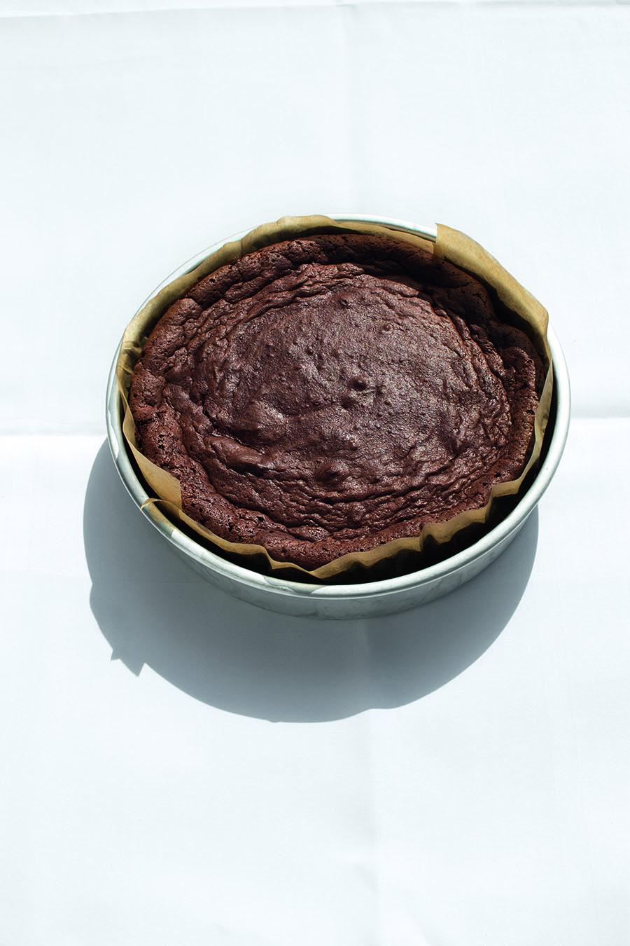 Stort het mengsel in de beklede taartvorm. Zet die 30 minuten in de oven, of tot de taart als een soufflé is gerezen en iets is opgestijfd.