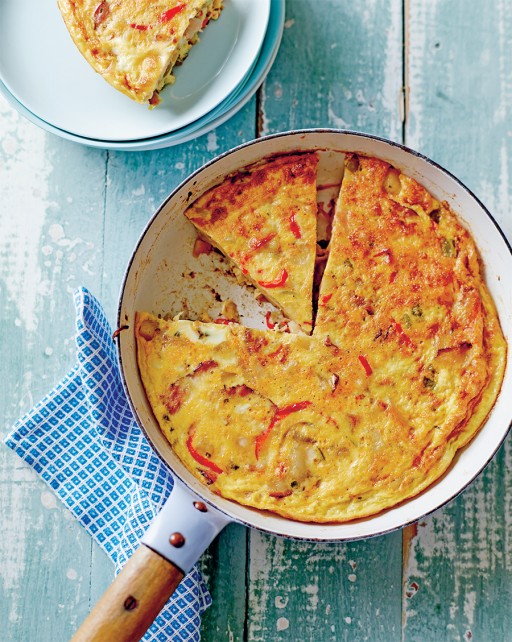 De Spaanse omelet (tortilla in het Spaans) was er al voor de Italiaanse frittata. Hij stamt uit de tijd van zwart-wittelevisie, waarin ‘grillen’ inhield dat je je eten ónder een vlam of gloeiende elektrische elementen moest leggen… Tegenwoordig grillen we met onderwarmte, meestal op de barbecue. Maar wat onveranderd is gebleven aan dit recept, is dat je de bovenkant van je omelet onder een superhete grill afmaakt. Perfect voor tijdens een avondje vol tapas.