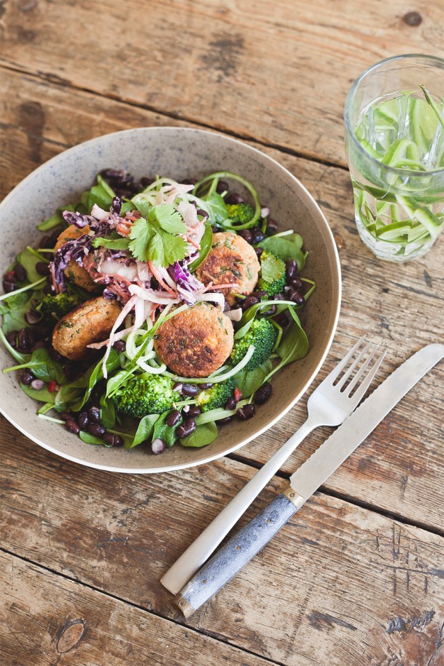 Verdeel vervolgens de zwarte bonen, de komkommer en de broccoli over beide borden en schenk er nog wat dressing overheen. Verdeel hierna de zoete aardappelburgertjes over de salades en voeg eventueel nog wat dressing toe. Maak de salade af met een grote hand gehakte koriander.