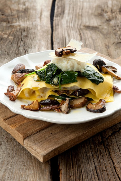 Leg er wat van de champignons rond, lepel er wat van de warme champignonolie over en versier met wat Parmezaan flakes. Serveer meteen.