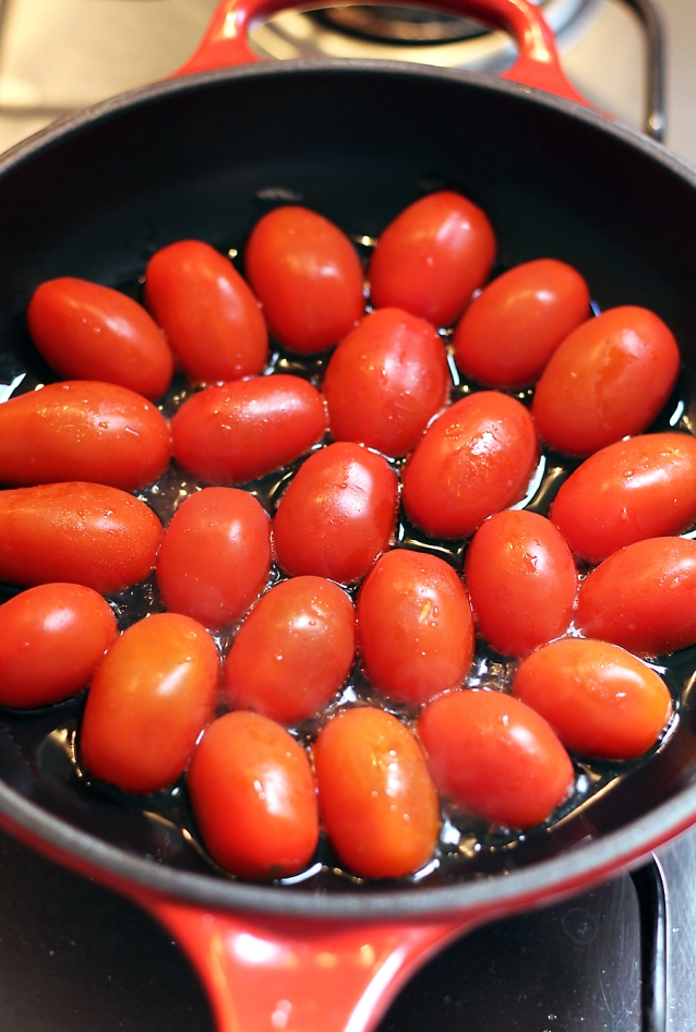 Halveer langwerpige cherrytomaatjes over de lengte en leg ze met de snijkant naar beneden in de pan, in een mooi patroon. Doe zoveel tomaatjes in de pan als past; ze krimpen namelijk nog als ze bakken. Zet het vuur laag tot medium en laat de tomaatjes in ongeveer 15 minuten zacht worden.