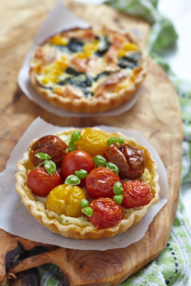 Leg alle ingrediënten in de voorgebakken bodempjes en giet hier voorzichtig het ei-zuivelmengsel over. Maak eventueel af met geraspte kaas.