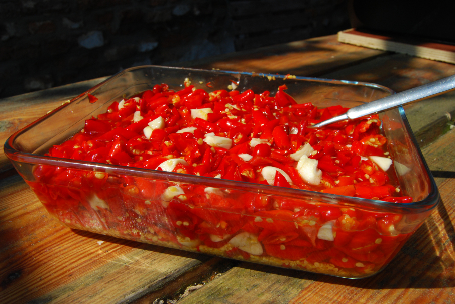 Snijd de knoflook en pepertjes grof en doe ze in een glazen pot of schaal. Tip: draag handschoentjes en wrijf niet in je ogen! Voeg het zout en de de azijn toe. Roer goed door en laat een nachtje in de koelkast staan (dit zorgt ervoor dat de pittigheid van de pepertjes wat subtieler wordt).