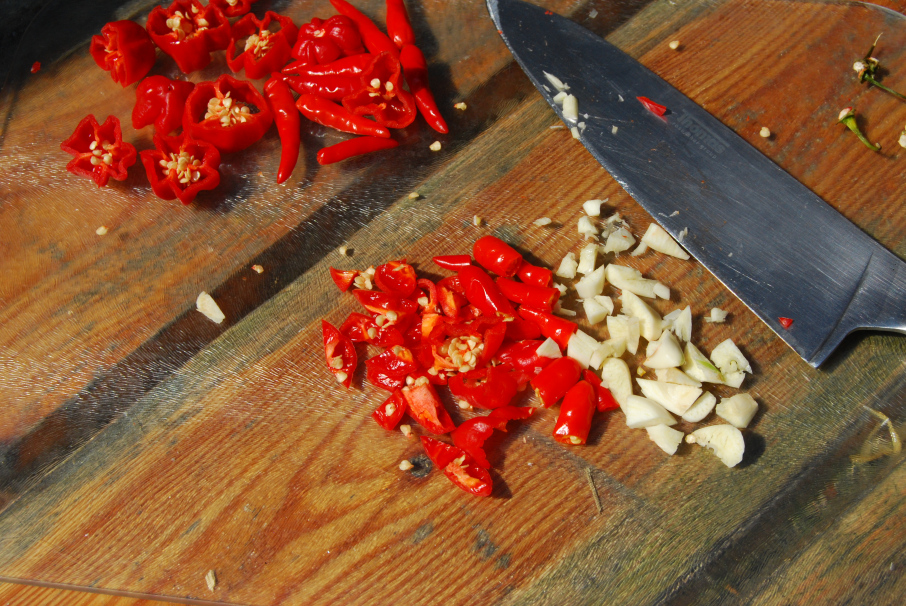 Let op: zelfgemaakte Sriracha is scherper dan de kant-en-klare versie! Wil je hem wat minder pittig hebben? Gebruik dan voor een groot deel Spaanse pepertjes en laat de Madame Jeanette peper achterwege.