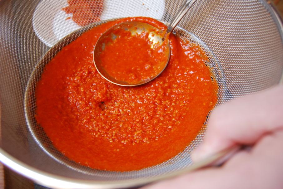 Doe azijn, peper en knoflook in een blender en mix ongeveer vijf minuten tot er een mooie puree ontstaat. Haal de puree door een fijne zeef en druk zo veel mogelijk saus erdoor met de bolle kant van een lepel.