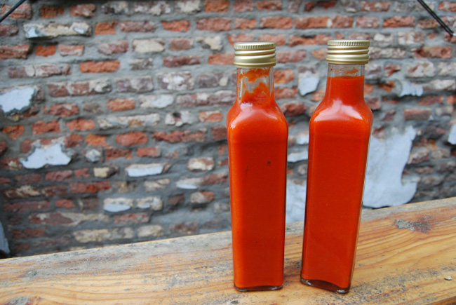 Tadaa: je zelfgemaakte Sriracha is een feit! Giet de saus in een glazen potje of een flesje dat goed af te sluiten is. Bewaar in de koelkast.