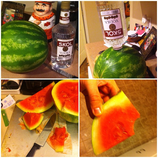 Maak een diep gat in de watermeloen. Giet de wodka met een trechter in de meloen. Er gaat aardig wat wodka in zo’n meloen, dus haal genoeg in huis!