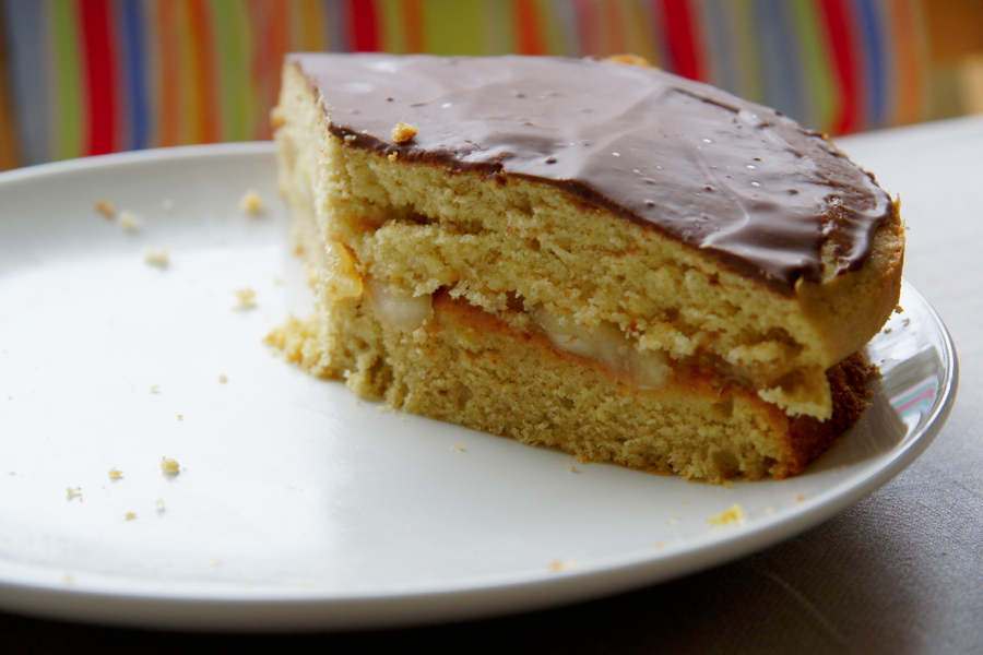 Kook de geschilde en gesneden appels in de jam, de citroenrasp- en sap totdat de appels zacht zijn, maar nog niet vorm hebben verloren. Smeer wanneer de appels zijn afgekoeld het mengsel over één van de cakehelften en top met de ander. Smelt de chocolade au bain-marie en smeer op de bovenkant van de Nusskuchen.