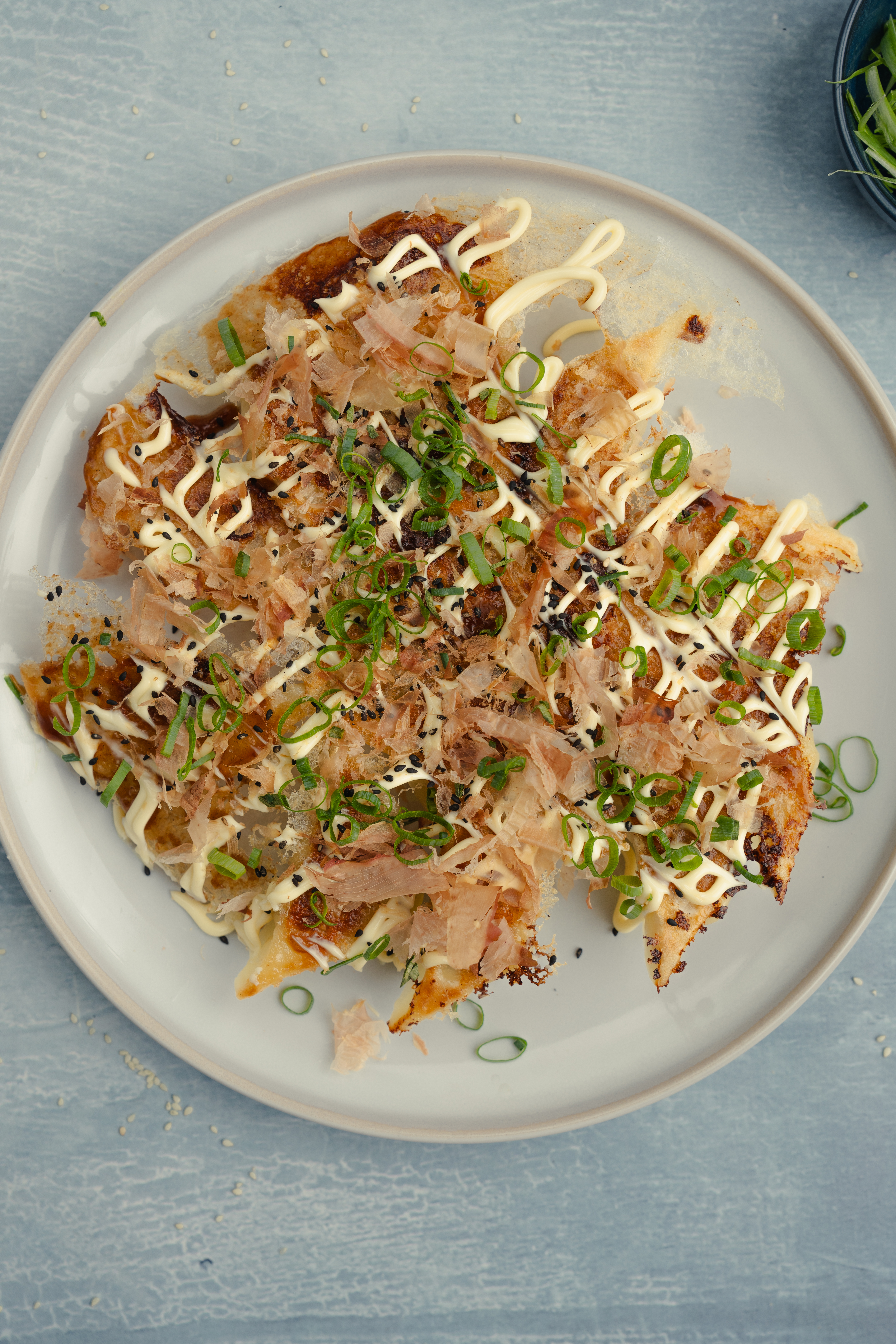 - Serveer met de krokante kroon naar boven. Verdeel de okonomiyakisaus, kewpiemayonaise, bonitoflakes en bosui over het geheel. Serveer direct.