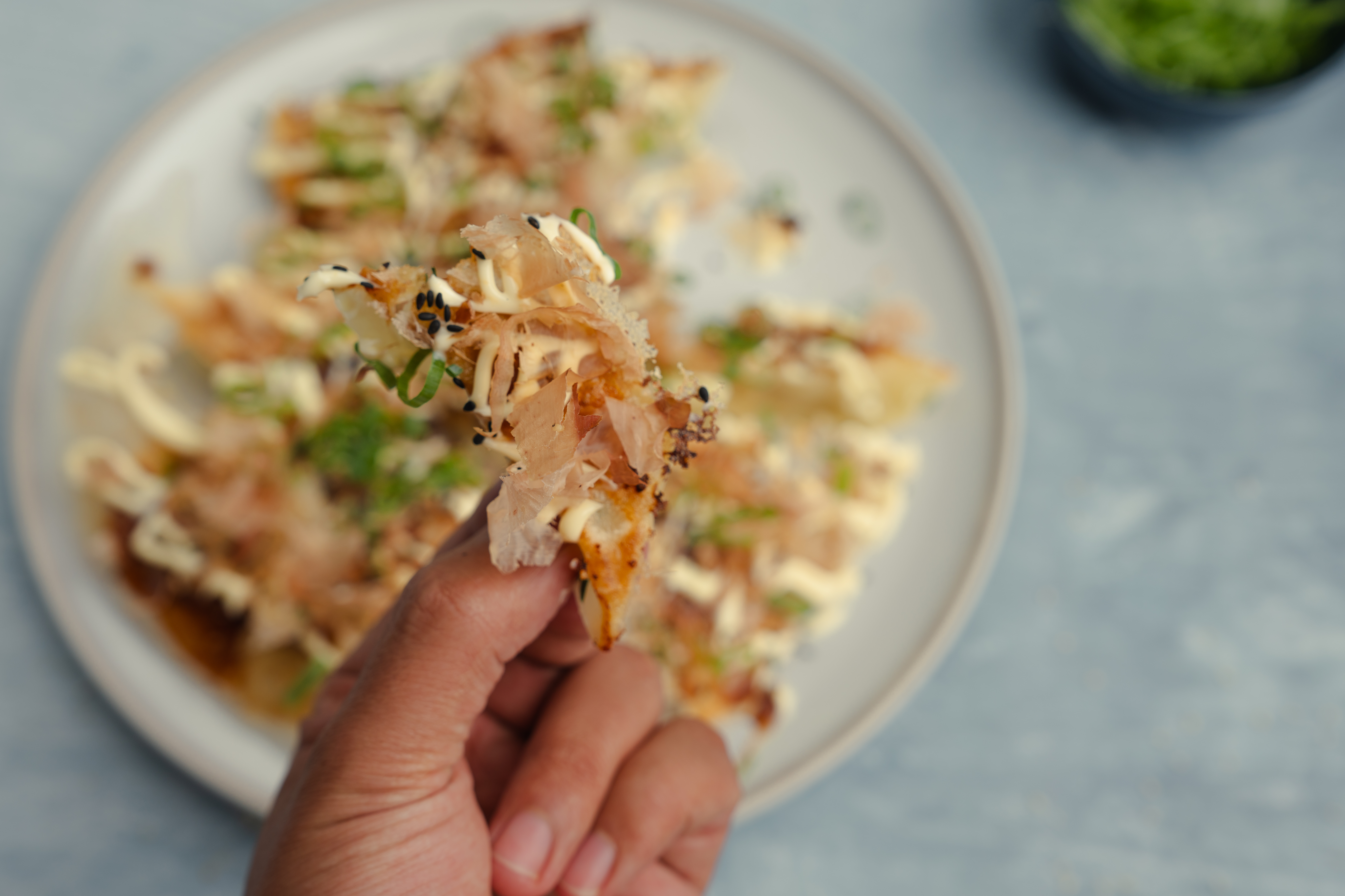 Daarna krijgen ze de smaakmakers van okonomiyaki mee. Denk aan lekker veel romige Kewpie-mayonaise, zoete okonomiyakisaus, dansende bonito flakes en frisse ringetjes bosui.