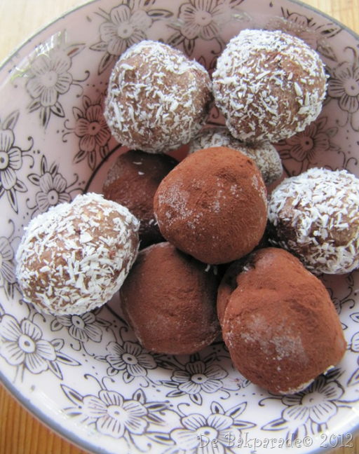 Neem één theelepel beslag en rol er een balletje van tussen je handen. Rol het balletje vervolgens door de cacao/kokos. Bewaar in de koelkast/diepvries.