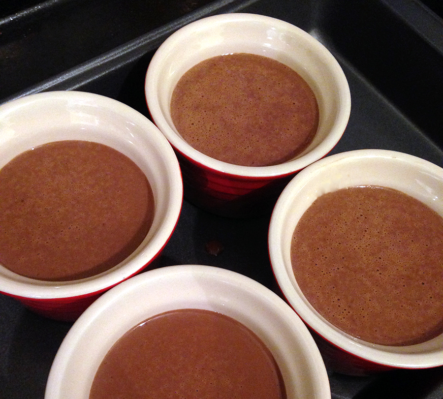 Kook een halve liter water in je waterkoker. Zet je ramequins of ovenschaaltjes in de grote ovenschaal of braadslee. Giet het chocolademengsel in de vormpjes totdat ze voor ongeveer driekwart gevuld zijn.