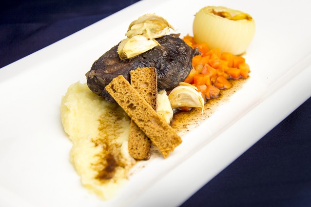 Yvette: “Kalfswangetjes zijn werkspul, geen biefstukje dat je aan beide zijden een hittestoot geeft en opdient. Nee, eerst aanbraden en dan langzaam stoven. Naast de gestoofde kalfswangen serveerde ik hutspot, maar dan gedeconstrueerd.”