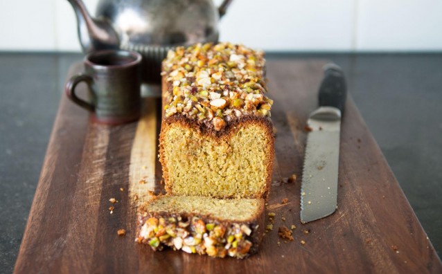 Hak de rest van de amandelen en pistachenoten grof en breng ze met de rest van de suiker, rest van de citroenrasp en citroensap in een pan aan de kook. Laat 5 minuten zachtjes inkoken en roer regelmatig. Verdeel de notenpasta over de cake en laat even afkoelen.