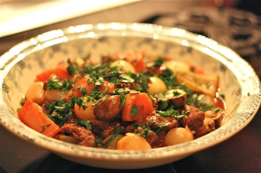 De stoof is lekker met aardappelpuree, gekookte aardappelen of wilde rijst. Maak het geheel af het verse peterselie.