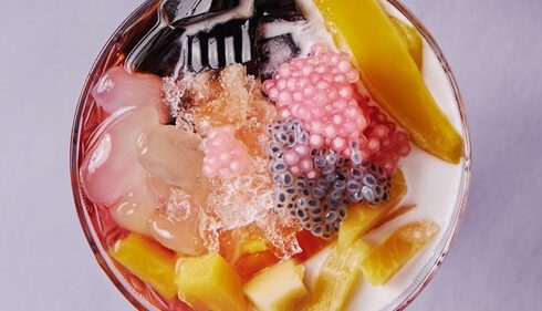 De combinatie van het ijs, fruit, de zoete siroop en de jelly maken van deze es tjampoer een complex maar verrassend drankje.