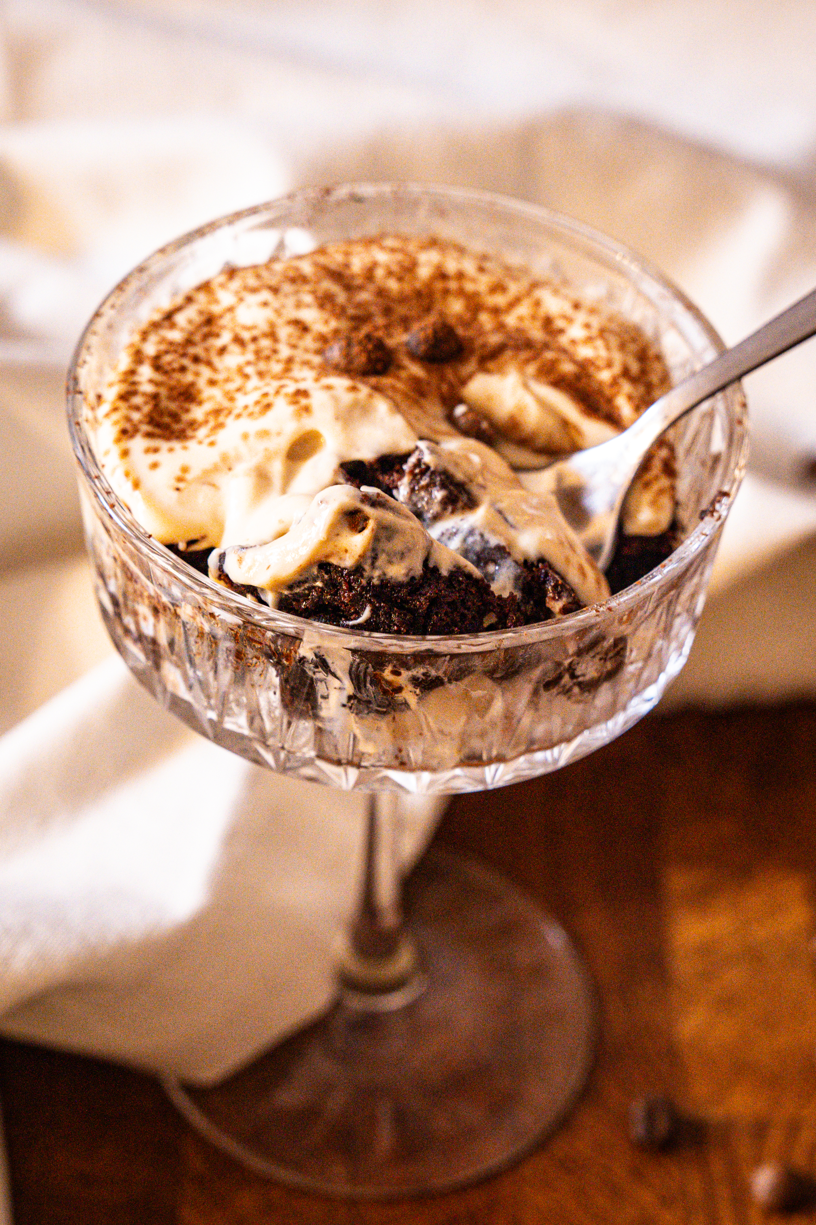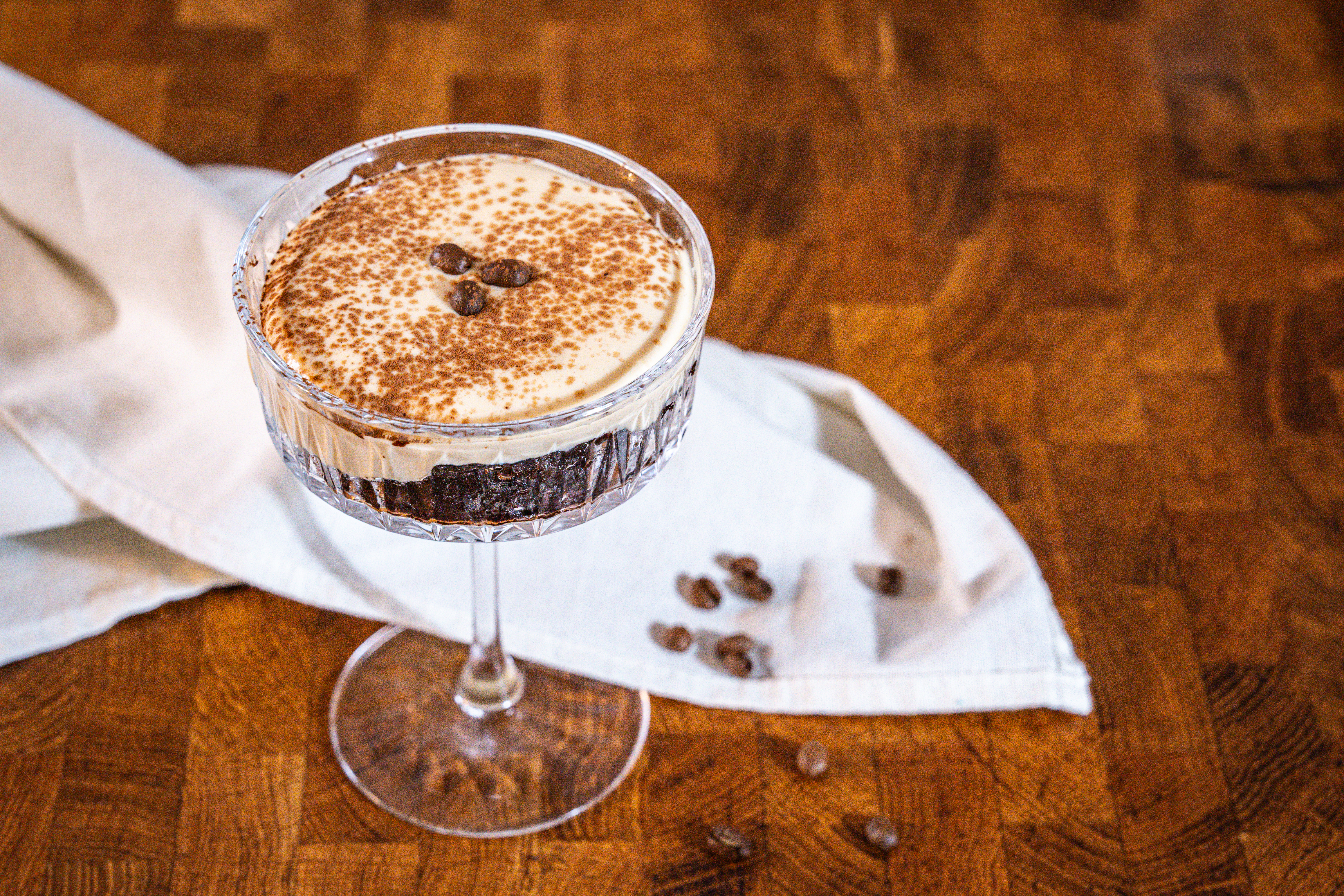 Makkelijk toetje: espresso martini brownie met mascarpone en espresso in feestelijke glaasjes