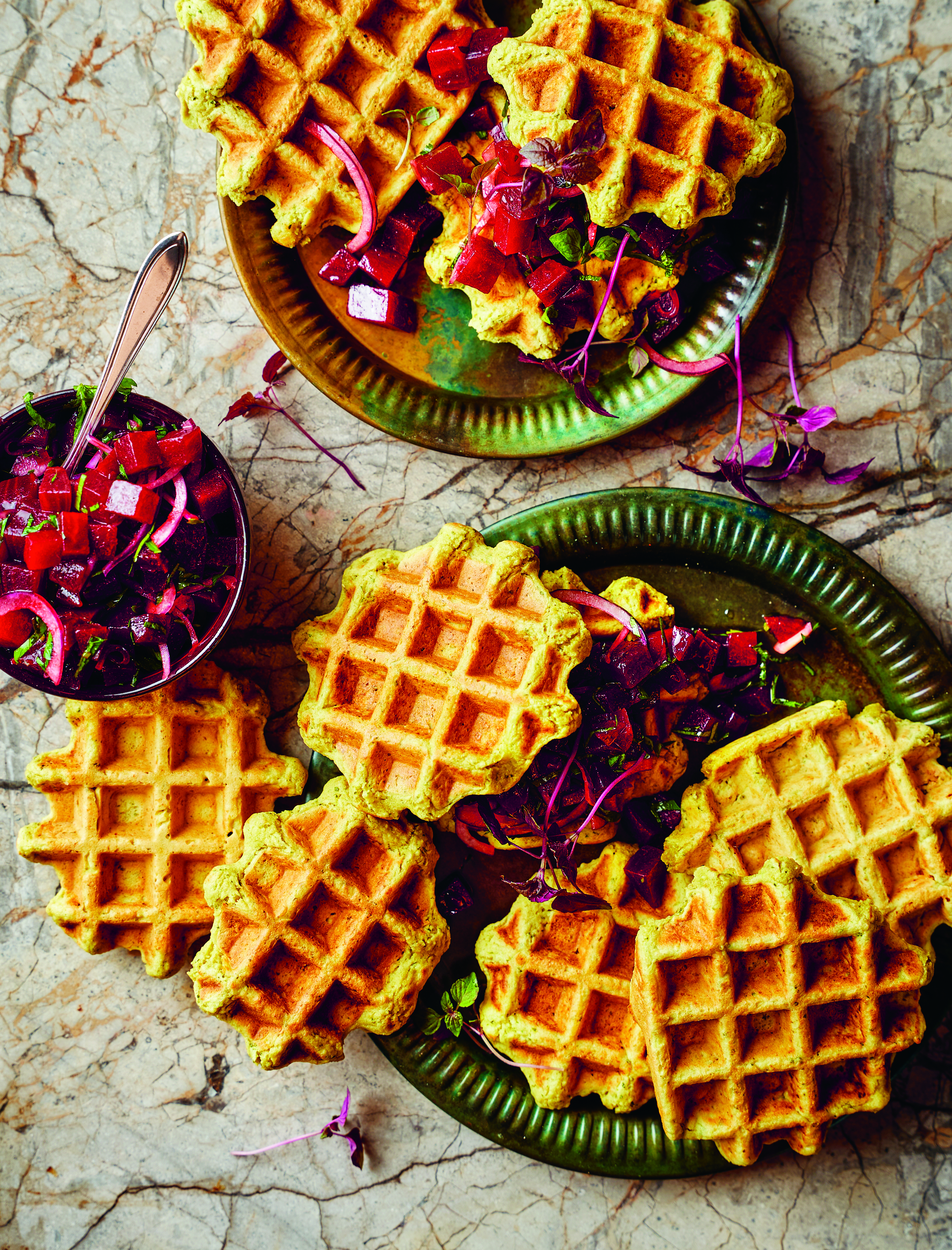 Deze heerlijke falafelwafels met rode-bietensalade van Mounir Toub komen uit zijn nieuwe boek ‘Snel Arabisch’.