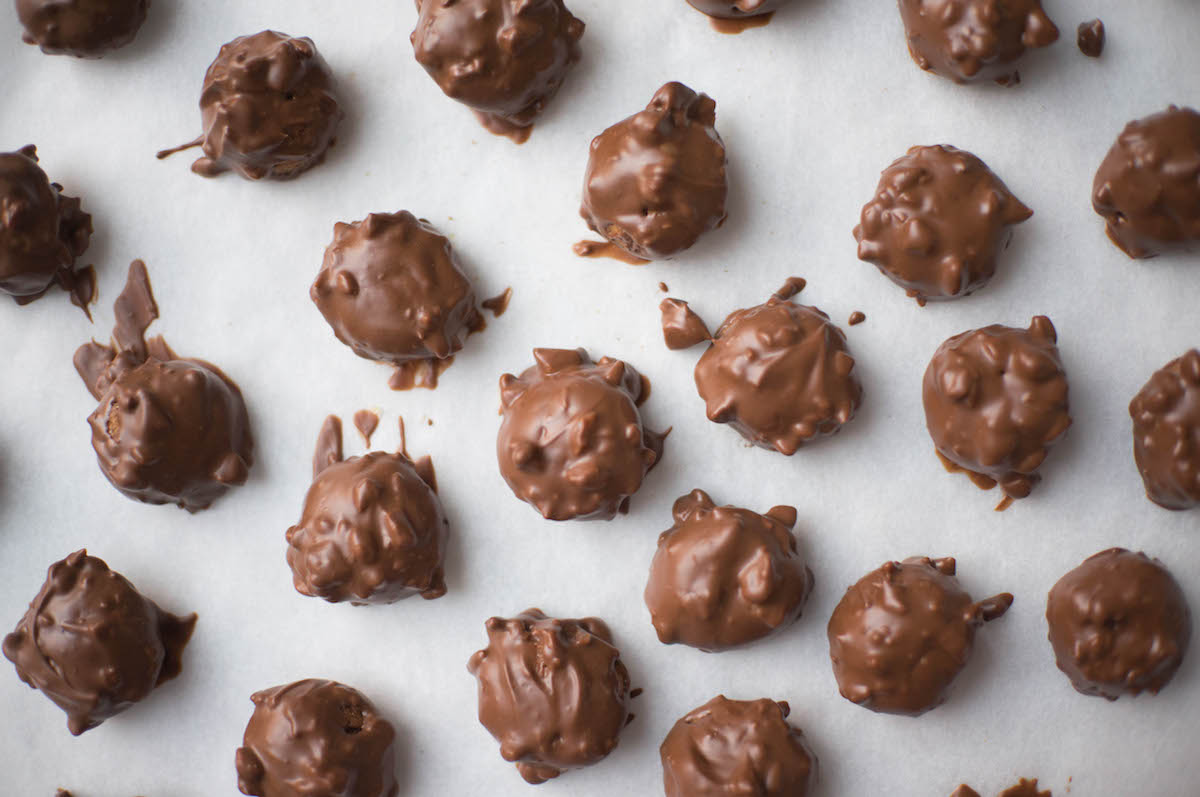 Leg de ferrero rocher-kruidnoten voorzichtig op het velletje bakpapier en laat uitharden. Tip: heb je ruimte in de koelkast, dan kun je ze daarin sneller laten uitharden.